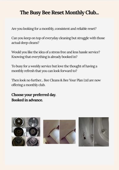 Here at Bee Cleans & Bee Your Plan Ltd we don't just clean your home, we take care of it too. We clean the areas that you can't see and we're not afraid to look for the hidden dirt, we don't cut corners. Client satisfaction is our absolute top priority and not only this we're a cleaning business that offers honesty, support, thoughtfulness, care and kindness.